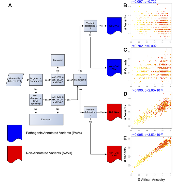 To characterize the extent and impact of ancestry-related biases in precision genomic medicine, we use 642 whole-genome sequences from the Consortium on Asthma among African-ancestry Populations in the Americas (CAAPA) project to evaluate typical filters and databases. We find significant correlations between estimated African ancestry proportions and the number of variants per individual in all variant classification sets but one. The source of these correlations is highlighted in more detail by looking at the interaction between filtering criteria and the ClinVar and Human Gene Mutation databases. ClinVar’s correlation, representing African ancestry-related bias, has changed over time amidst monthly updates, with the most extreme switch happening between March and April of 2014 (r=0.733 to r=−0.683). We identify 68 SNPs as the major drivers of this change in correlation. As long as ancestry-related bias when using these clinical databases is minimally recognized, the genetics community will face challenges with implementation, interpretation and cost-effectiveness when treating minority populations.